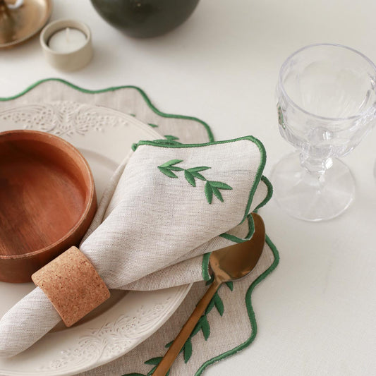 2'li Set Yeşil Yaprak İşlemeli Keten Peçete