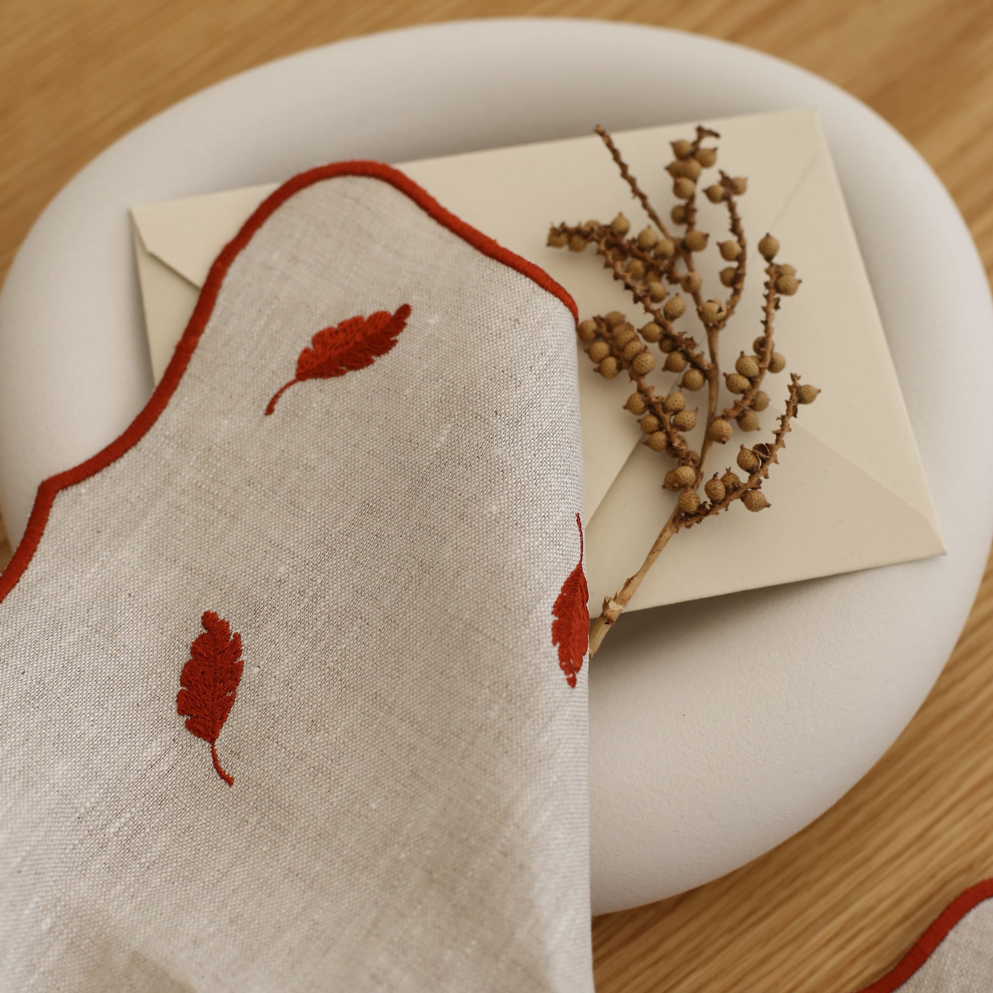 2'li Set Sonbahar Yaprakları İşlemeli Keten Amerikan Servis